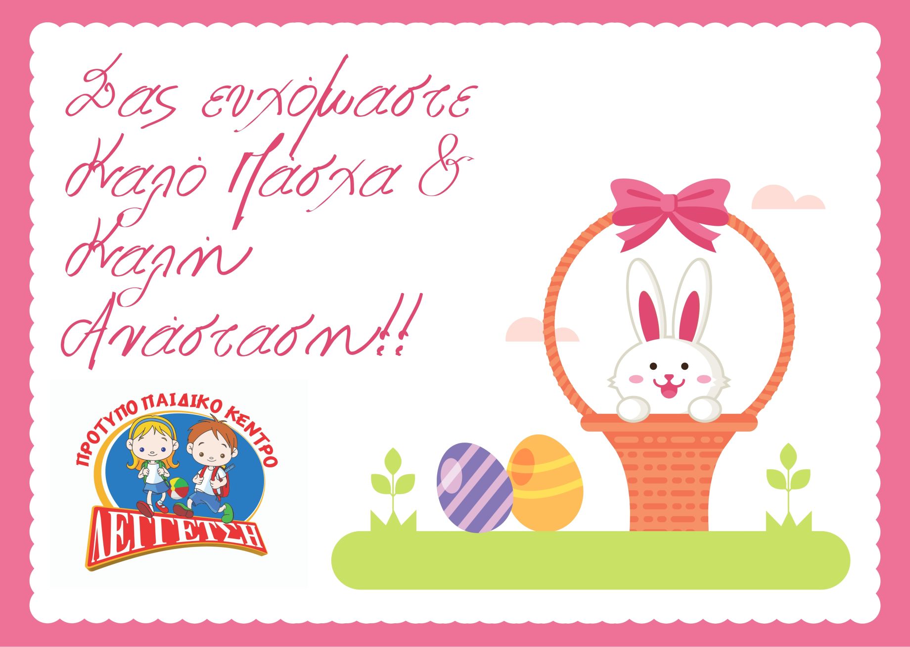 Καλό Πάσχα Γράφτηκε στις 01 Μαΐου 2021. Ευχές για Ανάσταση Ψυχής. Ο χρόνος που πέρασε ας αναστήσει μέσα μας την Επλίδα, την Εμπιστοσύνη και την Αγάπη Η Διεύθυνση και το Προσωπικό του Πρότυπου Παιδικού Κέντρου Λεγγέτση σας εύχεται Καλή Ανάσταση και Καλό Πάσχα!!! Προηγ Επόμενο