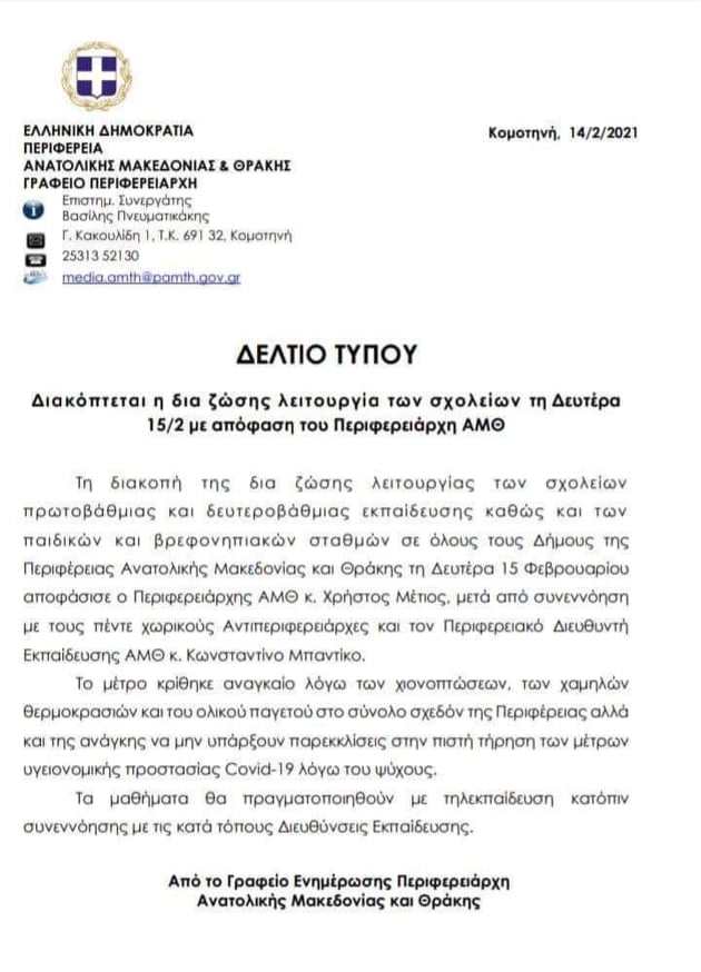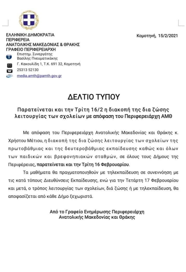 Ανακοίνωση για την Τρίτη 16/02/21 Με απόφαση του Περιφερειάρχη την Τρίτη 16 Φεβρουαρίου 2021,